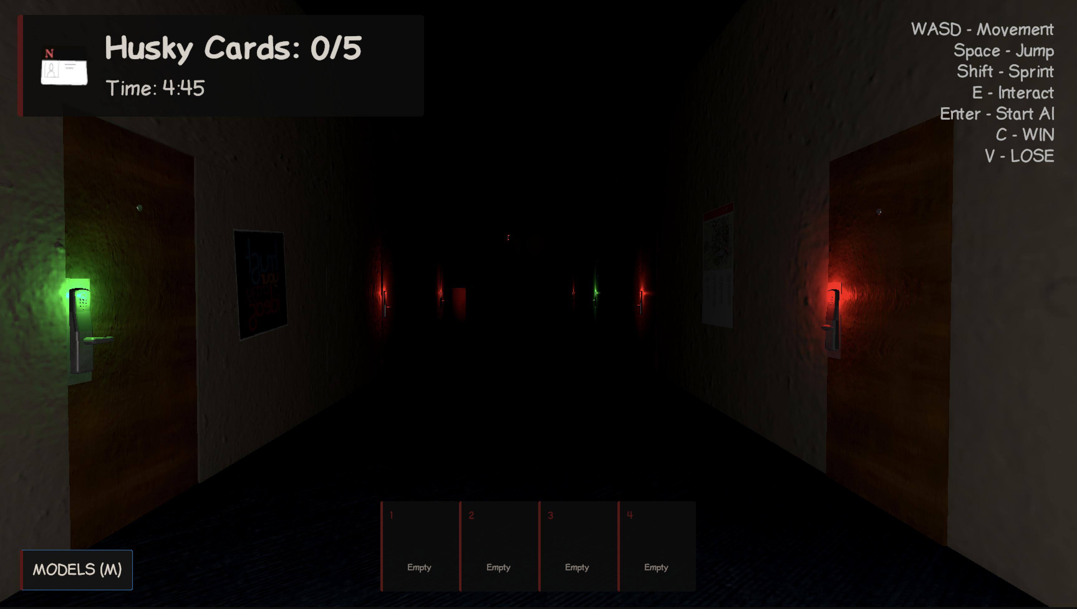 - Keycards — To unlock the exit door, all keycards must be in a player inventory and each player must have at least one keycard. Then, hold a keycard in your hand and pass through the exit door to escape. Once all players escape, all players win.